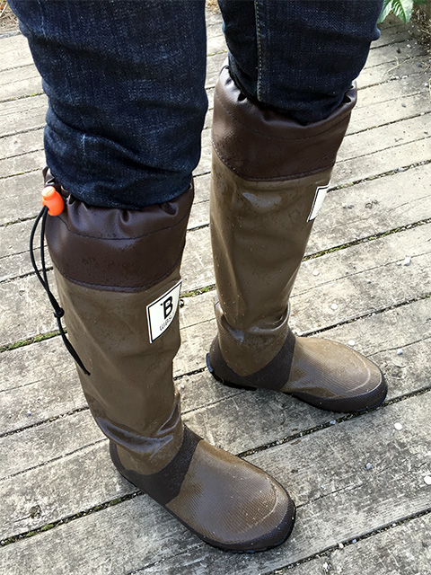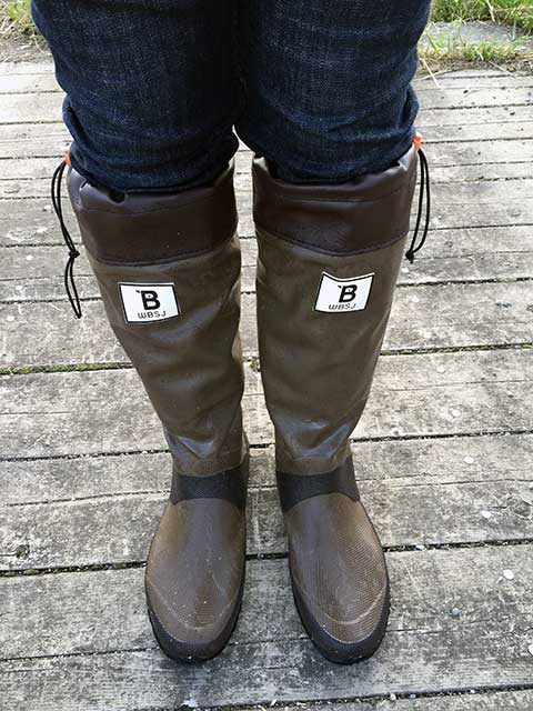 早速これを履いて釣りに出かけたのですが、砂利道や岩場ではソールの部分が薄いので足裏が痛くなってしまいます。あくまでレインブーツとしての使用が最適かと思います。あとゴムひもをしっかりと絞らないと、履き口がだんだんと落ちてきてしまうので注意が必要です。これはこれでくしゅっとしたショートブーツ風にできるのでいいかもしれませんが。
